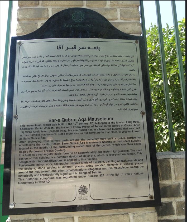 بقعه سر قبر آقا مدفن سیدابوالقاسم امام جمعه تهران و خاندانش در عهد محمدشاه و اوایل ناصرالدین شاه و محل دفن نویسندگان شناخته شدهای مانند مرحوم سعید نفیسی و ناظم الاطبا است.