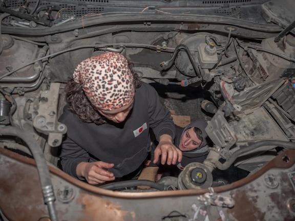 Kiana and Niloofar at Kiana's workplace north of Tehran on Feb. 5, 2022. They pulled out the engine, and are repairing the radiator. Forough Alaei