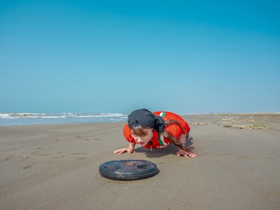 Zahra Yazdani Cherati is exercising at Jooybar city beach on May 27, 2024. Forough Alaei