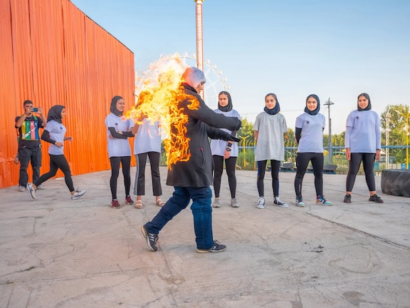 Nasrin instructing her class on a fire stunt in western Tehran on June 15, 2023. Forough Alaei