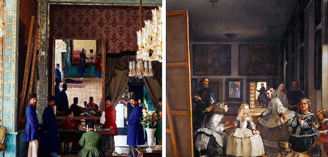 After colourising the photograph of the Mirror Hall (Talar-e Aineh), I noticed an unexpected connection that stretches from nineteenth-century Tehran back to the Spanish Golden Age. Photography arrived in Iran in 1844 with the Frenchman Jules Richard, whose lost daguerreotypes of Mohammad Shah and the young Nasir al-Din Mirza helped spark the court’s fascination with the new medium. By the 1850s and 60s, European instructors at the Dar al Funun were teaching the latest photographic techniques. Dar al Funun, Iran’s first modern polytechnic founded in 1851, became a crucial gateway through which European scientific and photographic knowledge entered the country. During this period, Naser al-Din Shah, newly crowned and endlessly curious, became an enthusiastic practitioner with his own palace studios and official court photographers. By the 1870s, independent studios such as those of Joseph Papaziyan and Antoin Sevruguin made Tehran a lively centre of visual experimentation. It was within this rich photographic culture that the Mirror Hall image was created, an image that, perhaps unintentionally, echoes the philosophical and optical puzzles of Las Meninas.