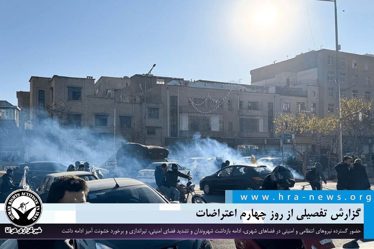 بر اساس اطلاعات جمعآوریشده، تجمعات و اعتصابات در روز چهارم، ویدیوهای منتشر شده نشان دهنده، استقرار نیروها و تجهیزات ضدشورش و کنترل تجمعات در خیابان ولیعصر، تقاطع خیابان امام خمینی تهران و خیابانهای شهر قدس بود.