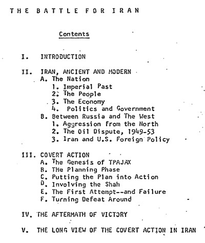 The Battle for Iran consists of five sections and six appendices. The 150-page document begins with a short introduction then 24 pages of background on Iran's history, population, economics, politics and government (reminiscent of the content of CIA's current "World Factbook"), more than half of which covers the Cold War period. After this section the agency, without identification or explanation, has inserted two pages of a handwritten outline of what may be the actual coup plan.