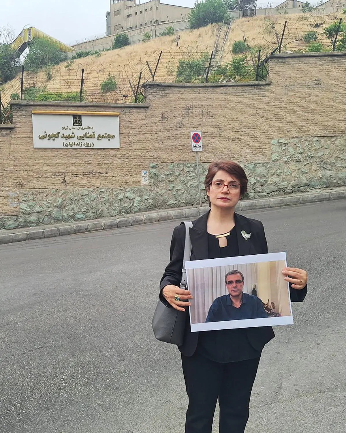 Nasrin Sotoudeh, a lawyer and human rights activist, stands in front of Tehran's Evin Prison, where her husband is being held, with a photo of him. Photo by Barbad Behravan