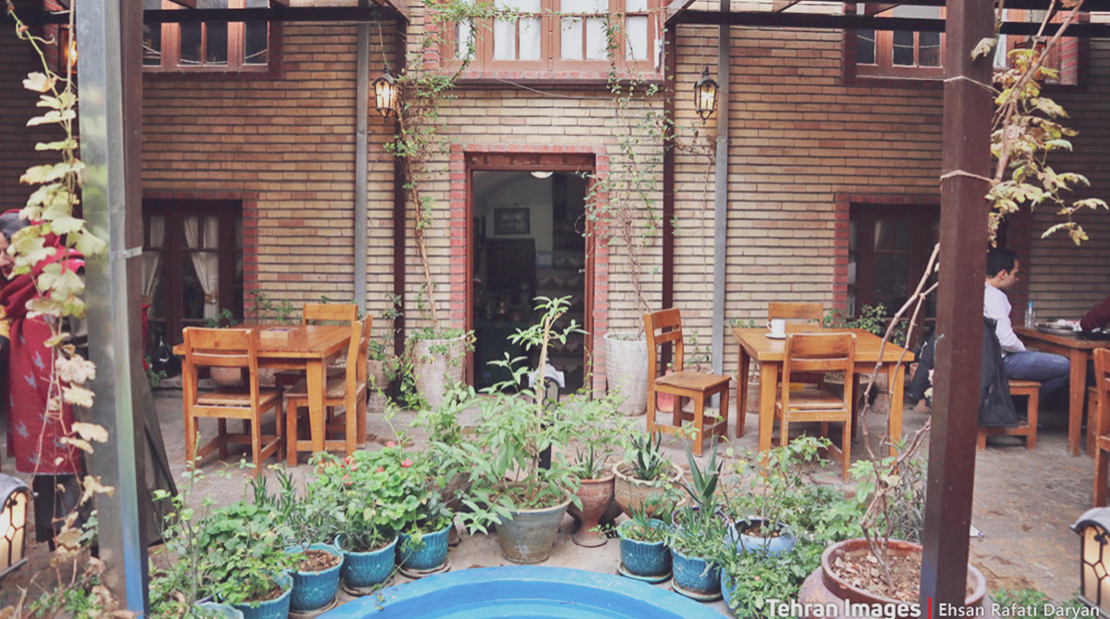 از لای درِ قدیمی که میگذری، حوض آبی رنگی با کاشیهای کوچک به مشتریان خوشامد میگوید. در کنار حوض چند درخت کاج بزرگ حاکی از قدمت بناست. دیوارهای آجریِ قرمزرنگ آدم را پرت میکند به گذشتهی دور. حاشیهی دیوار باغچهای است پر از گلهای شمعدانی. دور تا دور حوض و زیر چترهای بزرگ، میزهای کوچک و بزرگی مرتب چیدهاند، که همه پر است و جا برای نشستن در این حیاط دنج نیست. دختران و پسران جوان در جمعهای سه چهار نفری پشت میزها مشغول گپ و گفت هستند. در آن سوی این محیط نسبتاً شلوغ از پنجرهی ساختمان قدیمی قفسههای کتاب دیده میشود. اینجا یکی از کافه کتابهای تهران است.