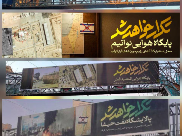 Iran erected banners across Tehran on Thursday threatening further attacks against Israel and a US base in Qatar, with state media publishing images of the banners showing maps and locations of strikes carried out during a 12‑day war in June.