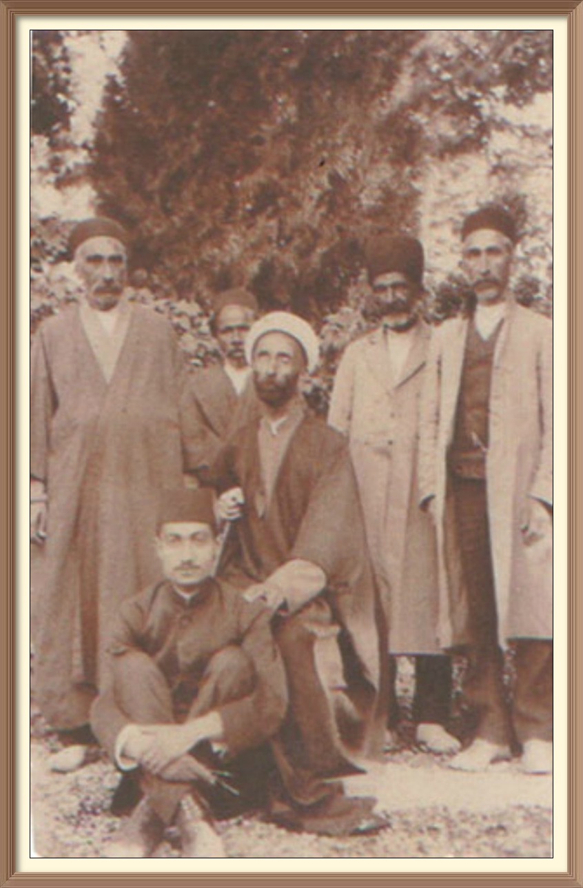 تصویری کم دیده از حضرتِ شوریدهٔ شیرازی. نفر نشسته که شوریده روی شانه اش دست گذاشته مرحوم مؤید الملک قَوامی می باشند.