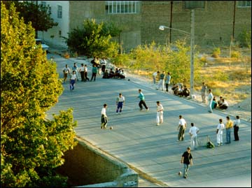 حیاط مدرسه ما تقریباً بشكل مربع بود یعنی طول و عرض مساوی داشت كه در حالت عادی برای بازی فوتبال مساعد نبود ولی برای یك دبیرستان دولتی كه ساختمانش در اصل منزل یكی از تجّار با نفوذ زمان قاجاریه بوده و حالا حیاطش را بخاطر مدرسه اسفالت كرده اند خیلی هم ایده آل بود. معمولاً میله های آهنی حلقه های بسكتبال را بجای دروازه بكار میبردیم. حلقه های بسكتبال در دو انتهای حیاط یعنی دو ضلع شرقی و غربی قرار داشتند كه تا به امروز كه سومین سال حضور من در این مدرسه است موجودی را ندیده ام كه توپ بسكتبالی را داخل آنها كند، و حتی مطمئن هستم كسی تا بحال توپ بسكتبال را با دستش لمس نكرده باشد تا چه برسد به اینكه بخواهد بازی كند. مشكل عمده ما موقع بازی ضلع غربی حیاط بود كه در كنارش توالت ها بودند. اولاً كه دیواری كوتاه و گچی مدرسه را از حیاط یك خانه شخصی جدا میكرد. بیشتر مواقع توپ از بالای دیوار رد شده و وارد حیاط خانه كذائی میشد و این یعنی پایان غم انگیز بازی كه حال همه را میگرفت، چون صاحب خانه عصبی با پس فرستادن توپ پلاستیكی پاره شده مان بصورت دو نیمكره بخیال خودش حال ما را میگرفت. البته در موارد استثنائی، مثلاً روزهای شنبه، اگر بچه ها پولی جمع میكردند از مغازه بقالی بغل مدرسه توپ جدیدی میخریدیم و به بازی ادامه میدادیم، و اینطوری به خرج خودمان روی صاحب خانه را كم میكردیم.