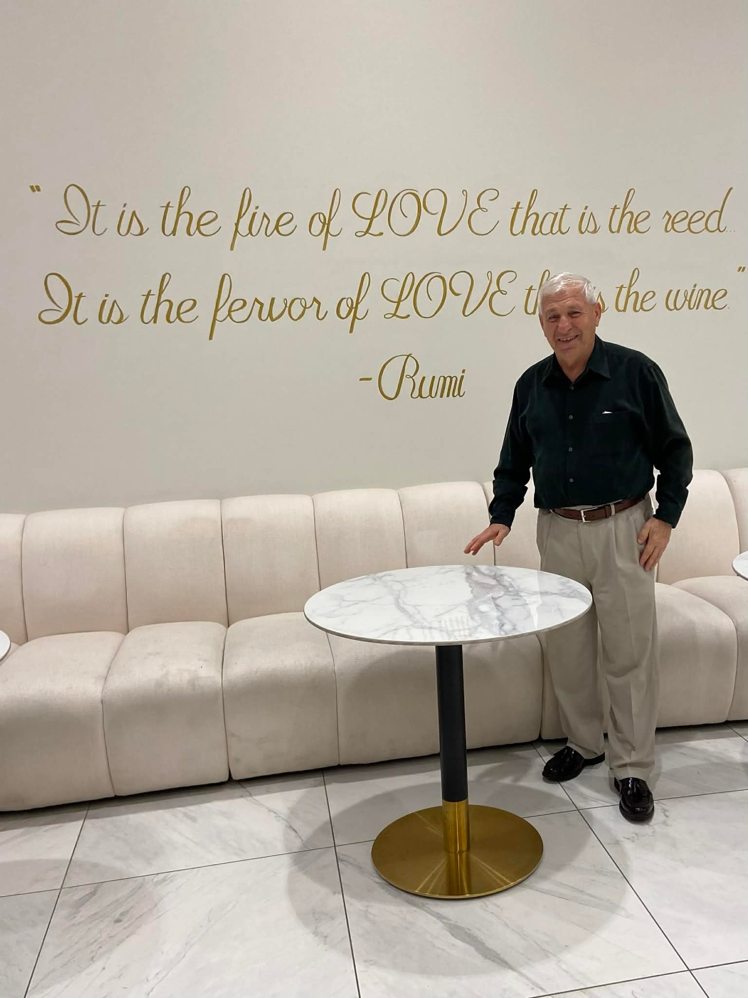 در ابتدا، رستوران کوچکی به نظر آمد نظیر بقّیه ی رستوران ها و چلوکبابی های ایرانی. ولی وقتی که برای شستن دست، پارا یکی دو قدم جلوتر گذاشته و به اتاق دیگری وارد شدیم خود را در ساختمانی بسیار بزرگ و مدرن یافتیم با زمین هایی سنگ فرش شده از مرمر سفید، با دیوارهایی مزّین به ترجمه ی انگلیسی بیتی از مولانا ( آتش عشق است کاندر نی فتاد/ جوشش عشق است کاندر می فتاد) بخطّ طلایی ، با نقّاشی های زیبای دیگر روی دیوارها که فرش های پر نقش ونگار ایرانی هم جلوه ی همه ی آن ها را دو چندان کرده بود. آقایی میان سال با چهره ای مهربان و متواضع هم در آن سالن بزرگ روی کاناپه ای زیر شعر مولانا نشسته بود. وقتی سر صحبت باز شد، معلوم شد که ایشان یکی از بانیان و مؤسّسان آن مکان عظیم و زیبا هستند. ایشان از سر لطف به ما پیشنهاد کردند که قسمت های مختلف آن ساختمان عظیم را به ما نشان داده و توضیحاتی درباره ی آن بدهند. این پیشنهاد هم زمان شد با رسیدن غذاهای ما. پس از ایشان خواهش کردیم که ابتدا اجازه بدهند که ما شکمی با خوردن چلوکباب از عزا در بیاوریم و سپس به بازدید از آن مجموعه بپردازیم.