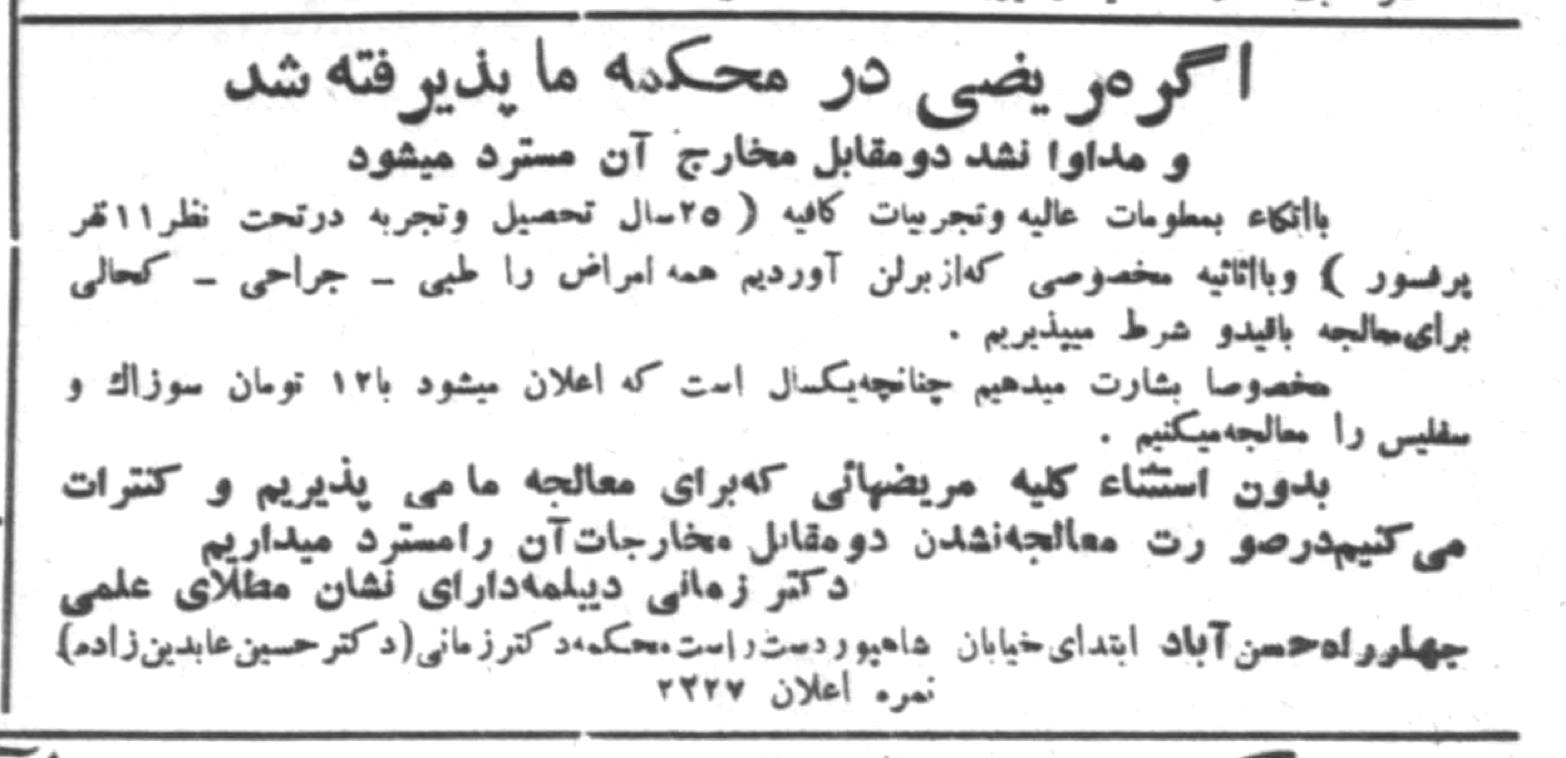 آگهی های جمع آوری شده در اینجا از مطبوعات منتشر شده بین سال های ۱۳۰۵ تا ۱۳۱۰هجری شمسی (۱۹۲۶ تا ۱۹۳۱ میلادی) انتخاب شده اند.
