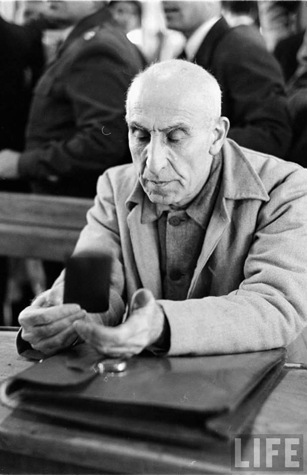 زنده یاد دکتر محمد مصدق نخست وزیر ایران در دادگاه نظامی بعد از کودتای ۲۸ مرداد ۱۳۳۲. در حال چک کردن فیسبوک و اس ام اس با موبایل هوشمند