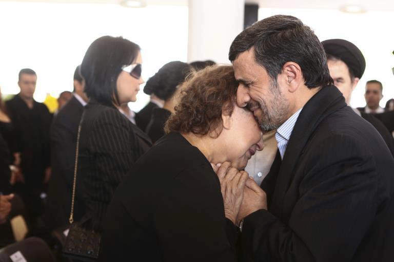 محمود احمدی نژاد در مراسم تشیع هوگو چاوز مادر سوگوار رئیس جمهوری ونزوئلا را دلداری می دهد.