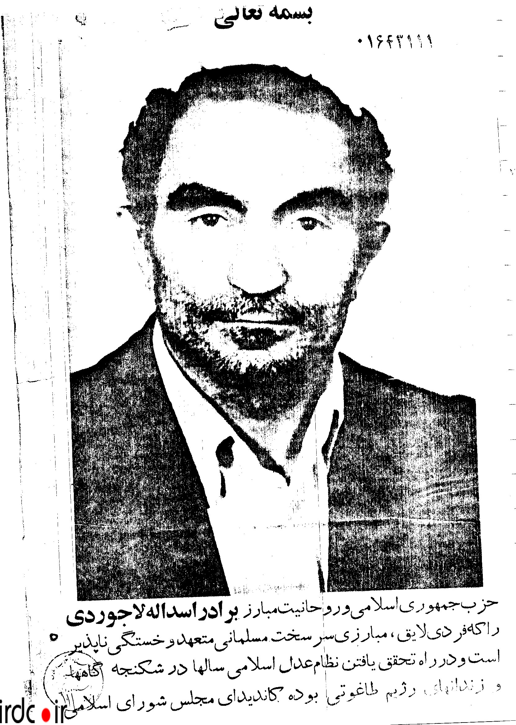 پوستر تبلیغاتی اسدالله لاجوردی در انتخابات دورۀ اول مجلس (۱۳۵۸)