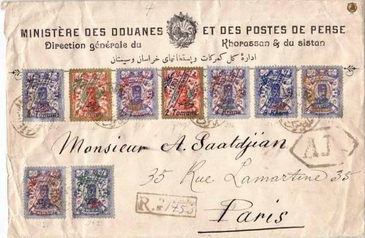 تصویر پاکت نامه پست شده از اداره پست استان خراسان ویا سیستان به مقصد شهر پاریس در فرانسه در دوره قاجار با تمبرهای ناصری