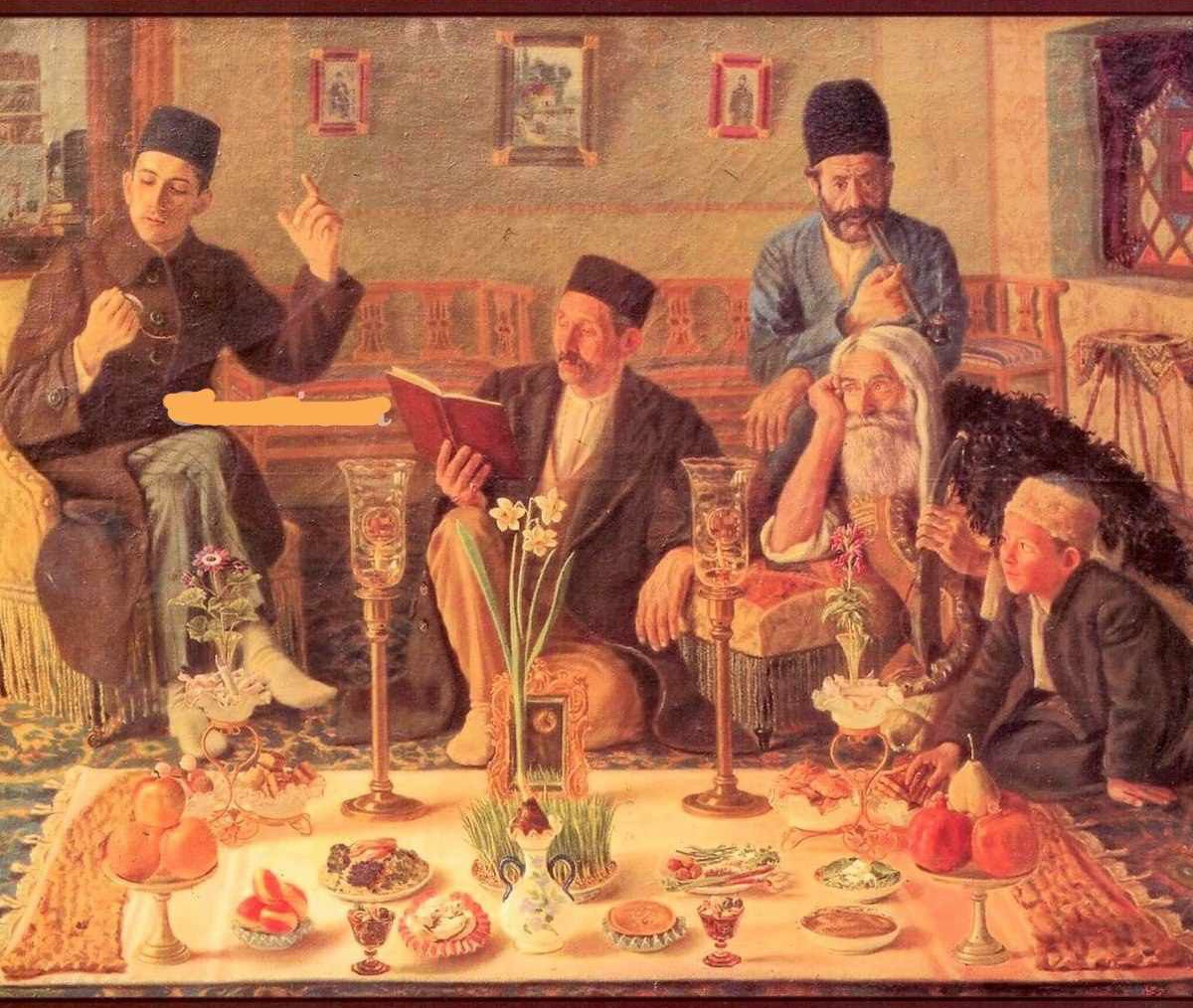 عکس از تابلوی معروف هفت سین اثر حسین شیخ از شاگردان کمال الملک ، نکته قابل توجه در این اثر این است که ماهی قرمز درگذشته و در دوران سلاطین قاجار که این نقاشی ترسیم شده ، جایی در میان سفره هفت سین نداشته ، ولی از نظر بنده ایرادی هم ندارد که الان مرسوم شده است ، نوروزتان پیروز