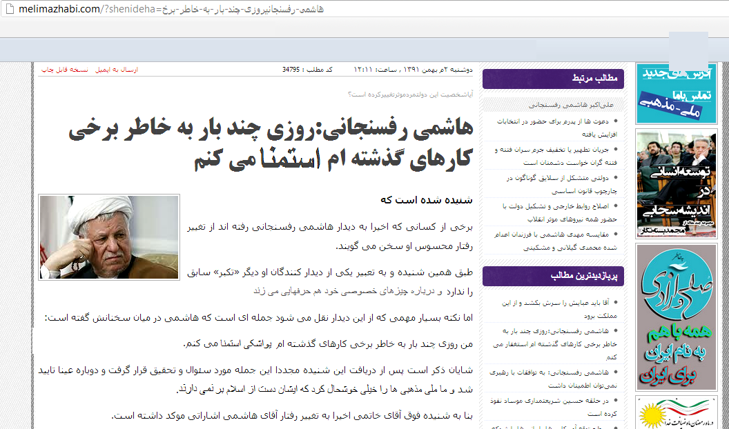 خوشحالی ملی مذهبی ها: رفسنحانی: روزی چند بار بخاطر کارهای گذشته ام استمن... می کنم